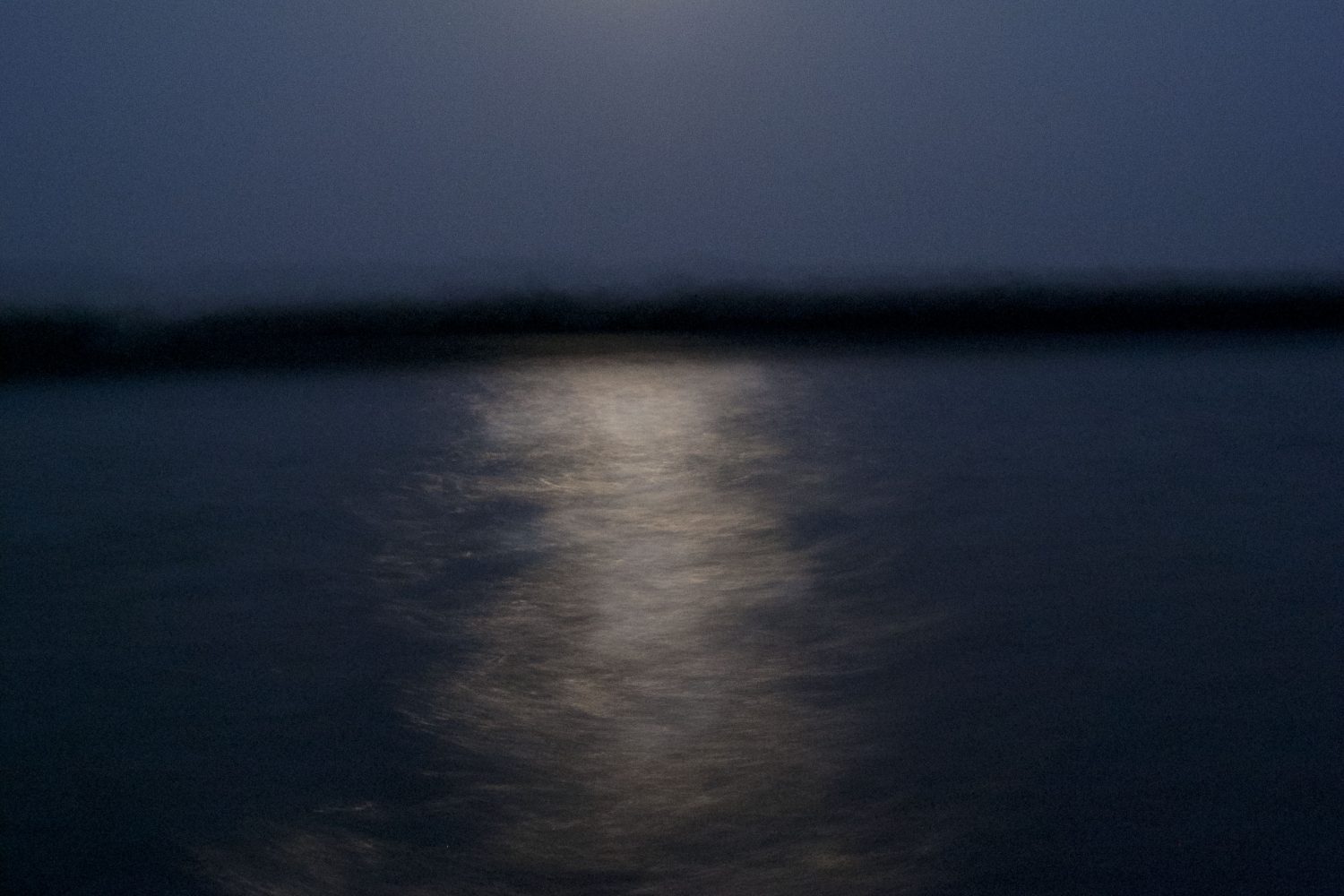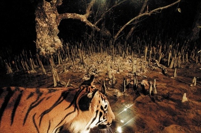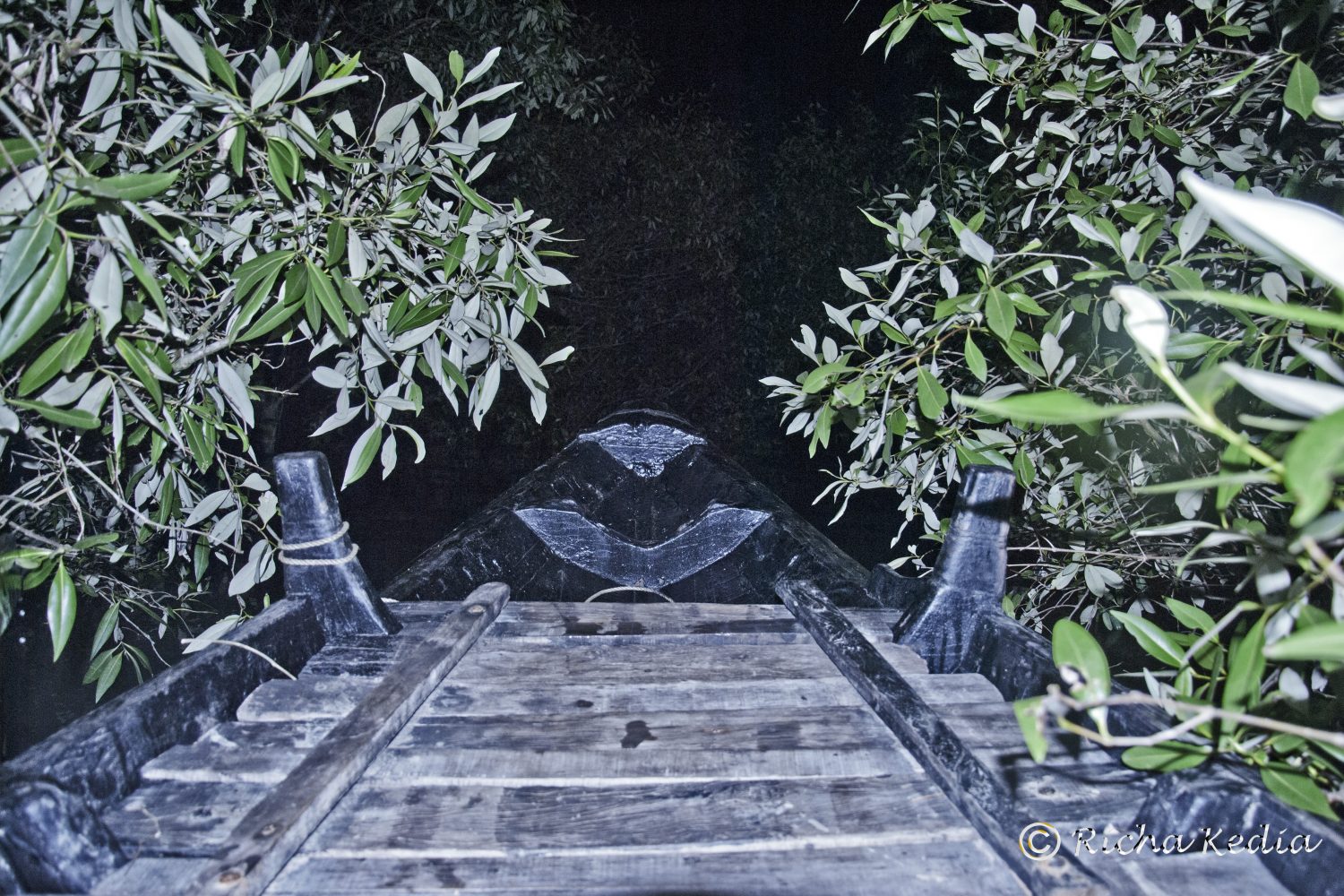 In the night safari, the most interesting part of the Sundarbans adventure, we went in a small rowing boat on the water that had completely engulfed the land, presenting an entirely different landscape in the high time. Most of the trees around were submerged. Thereby we crossed over to the other side of the river and the boatman steered the boat into 1 of the channels that were part of the landmass during the low tide but now had water flowing through.